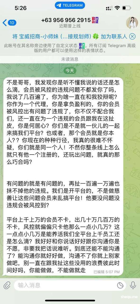宝威账号:fc24721 绝对是正常游戏绝无违规操作,代理不回复不知道是不是被抓,跟了几年的代理一直还挺靠谱的,换台子就跟过来,账号存款没要过一毛钱彩金,说我违规投注,请平台领导核查处理!!!